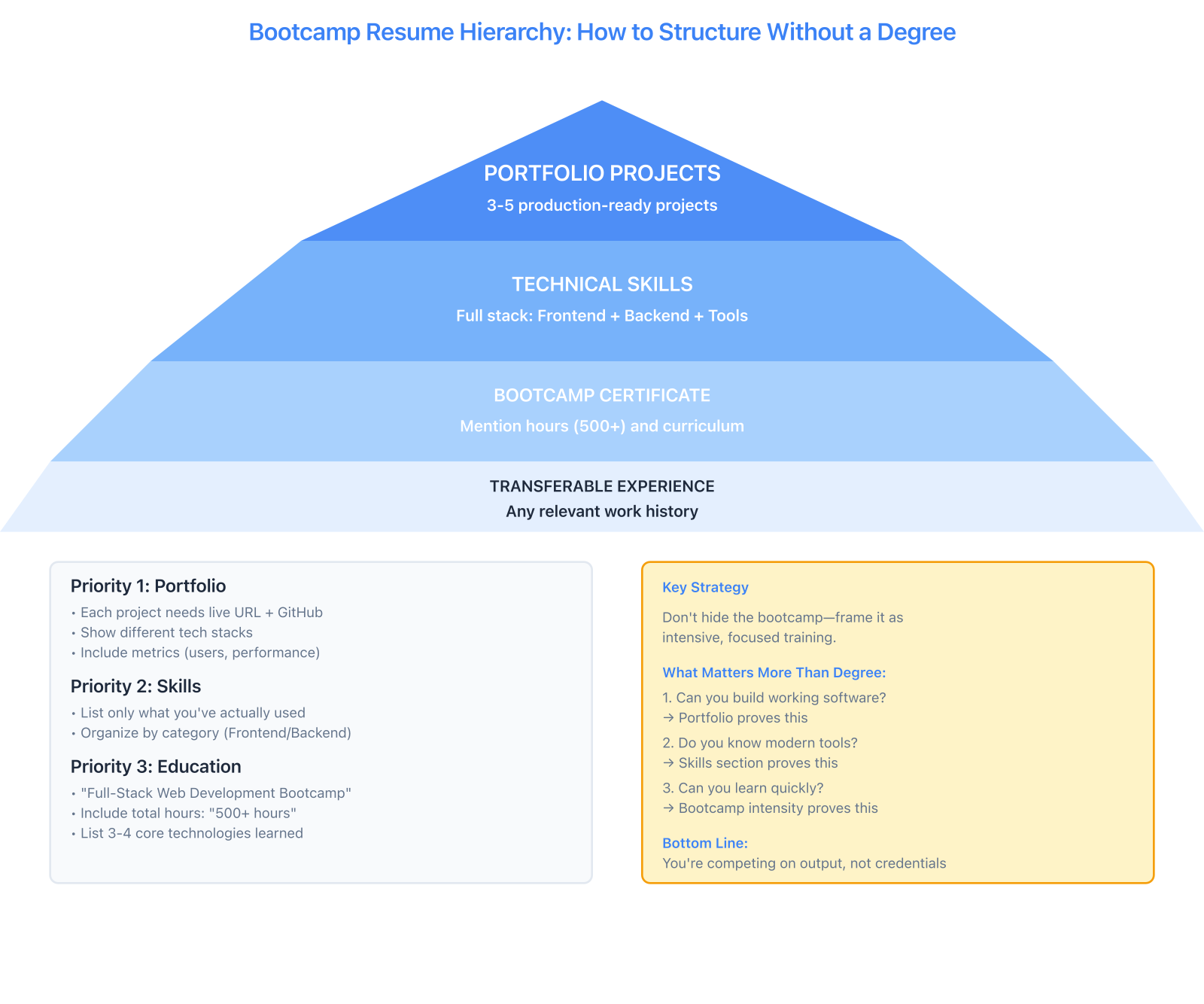 The inverted hierarchy for bootcamp grads: lead with what you can build, not where you studied. Your portfolio proves capability better than any certificate.